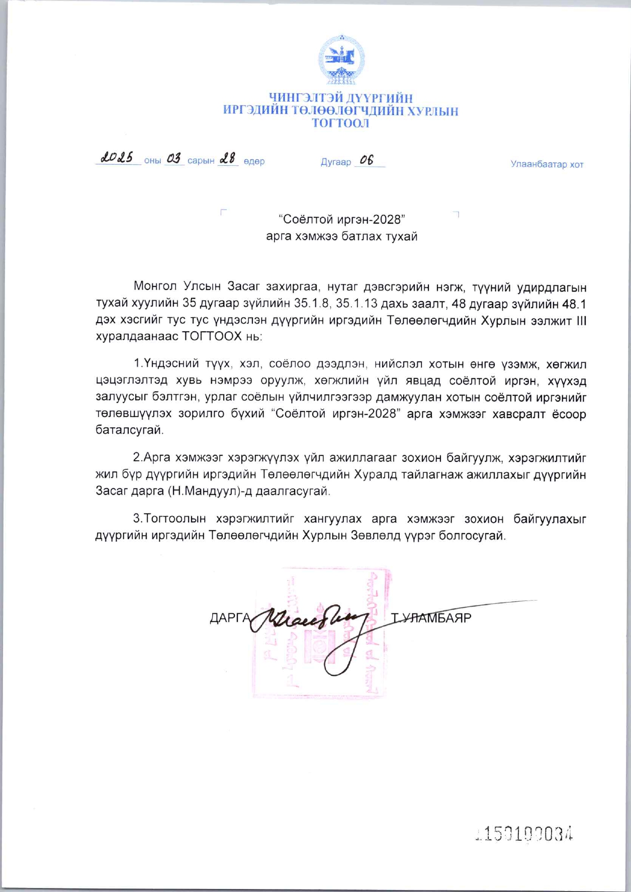 2020-2024 оны НИТХ-аас баталсан тогтоол шийдвэрүүдийг хүлээлгэн өглөө